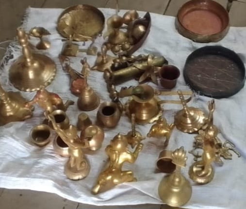 উদ্ধারকৃত মালামালের মধ্যে ৩ টি পিতলের তৈরী গোপালের ছোট মূর্তি ১ টি পিতলের নিতাই মূর্তি ও ১টি পিতলের গৌর মূর্তি ১ টি পিতলের তৈরী মা কালীর মূর্তি ২ টি পিতলের তৈরী ঘন্টা ২টি কাশার কাশি ও ১টি পিতলের বৃপ্তি ১ টি পিতলের পঞ্চ প্রদীপ ও ০১ টি তামার বাটি ১টি ছোট ও ০১টি বড় তামার শিব কোষ ১টি পিতলের সর্প মূর্তি সম্বলিত পঞ্চ প্রদীপ