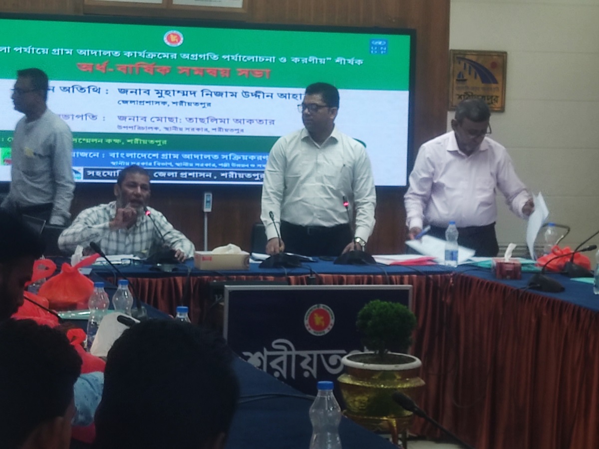 শরীয়তপুরে গ্রাম আদালত সক্রিয়করন(৩য় পর্যায়) প্রকল্পের অর্ধ বার্ষিক সমন্বয় সভা গত রোববার সকাল ১০টায় শরীয়তপুর জেলা প্রশাসকের সম্মেলন কক্ষে অনুষ্ঠিত হয়। জেলা প্রশাসনের আয়োজনে স্থানীয় সরকার বিভাগের উপপরিচআলক তাছলিমা আকতারের সভাপতিত্বে সমন্বয় সভায় প্রধান অতিথি হিসেবে বক্তব্য রাখেন শরীয়তপুরের জেলা প্রশাসক মুহাম্মদ নিজাম উদ্দীন আহম্মেদ।